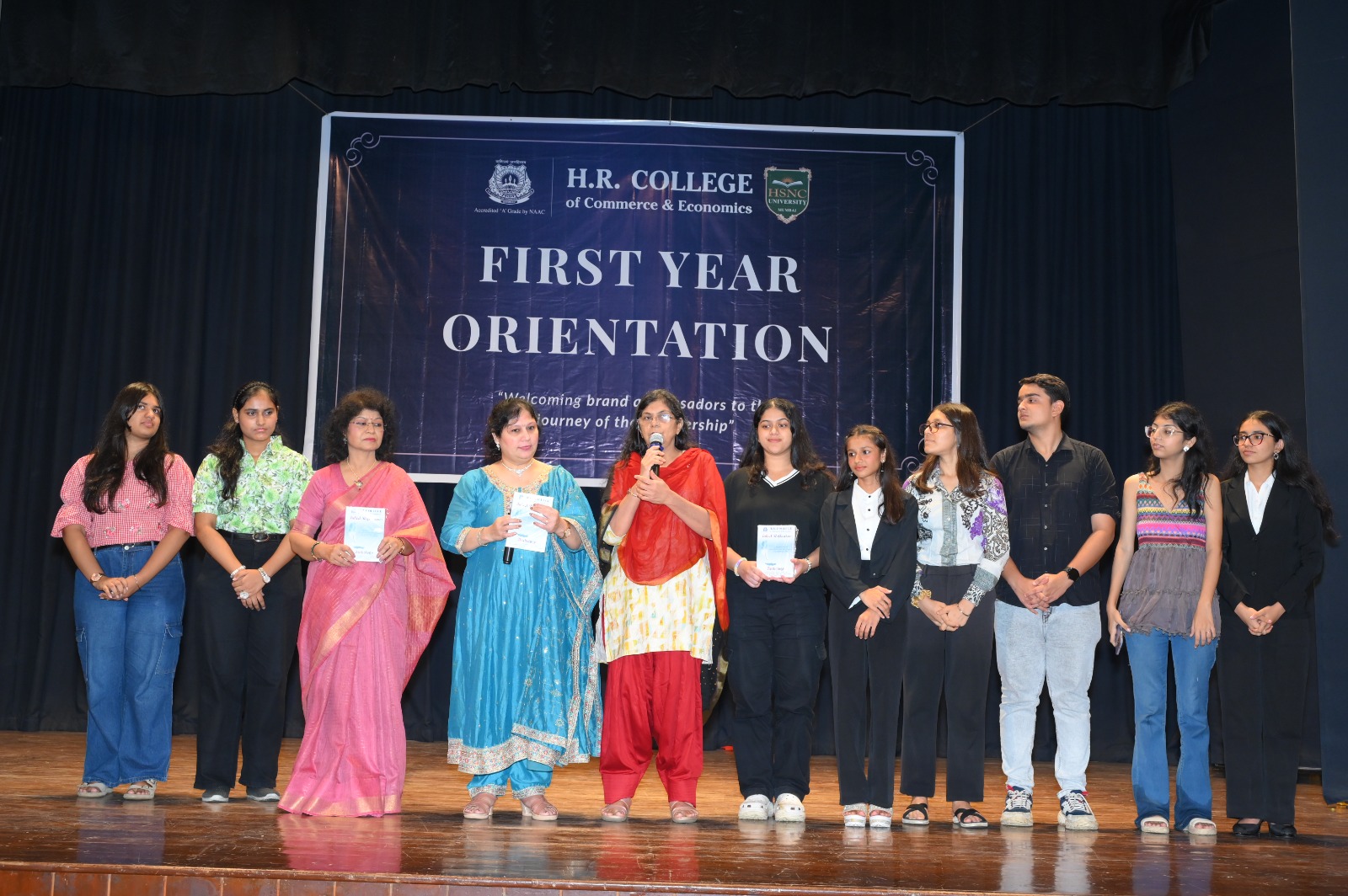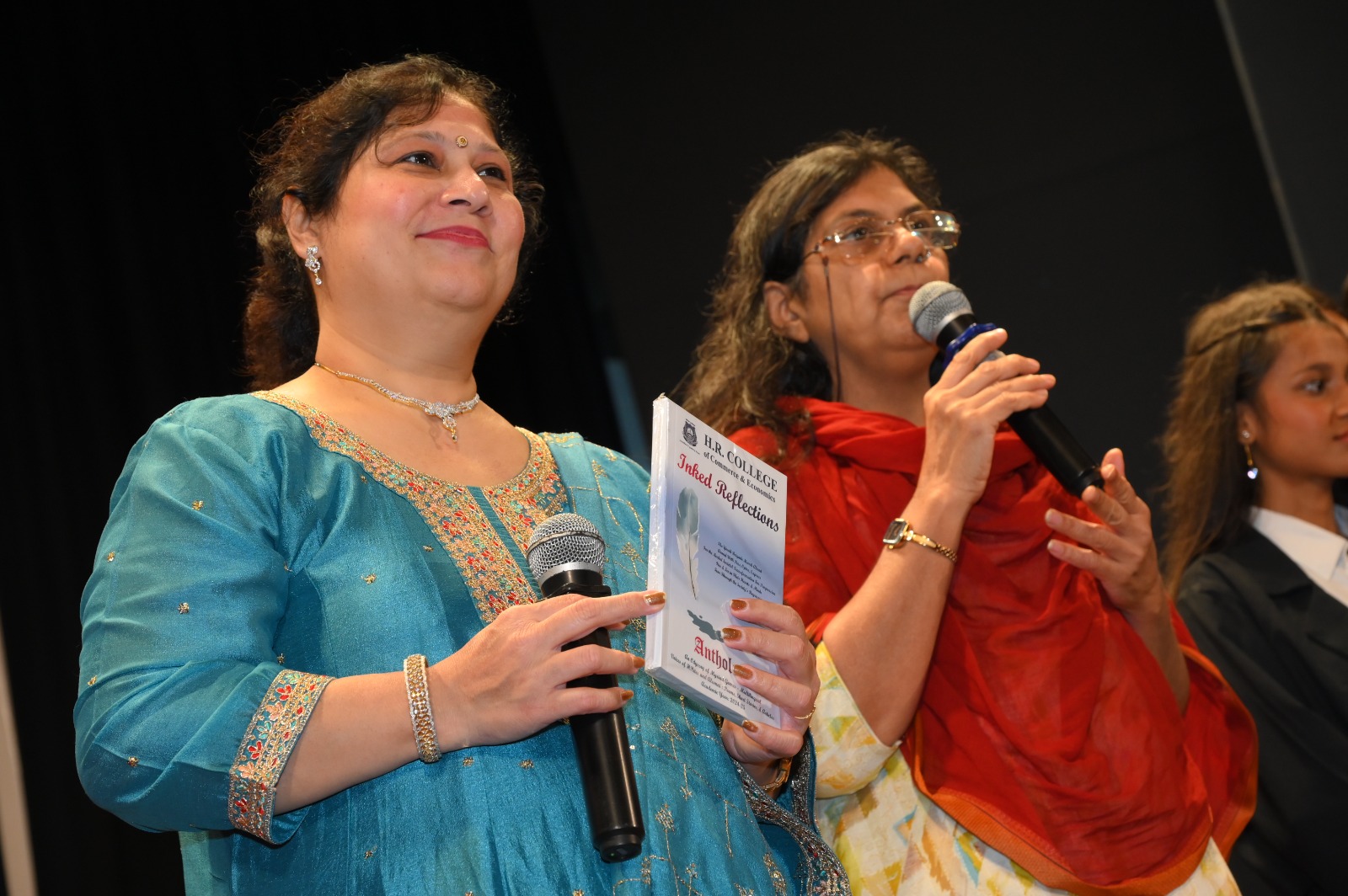 Mr. Kishu H. Mansukhani, President of the HSNC Board; Dr. [Mrs.] Pooja Ramchandani, Principal of H.R. College of Commerce & Economics; Chief Guest Mrs. Meghna Pant, a celebrated author, feminist, journalist, speaker, columnist & screenwriter, unveiled the anthology of poems - The Creative Young Bards.