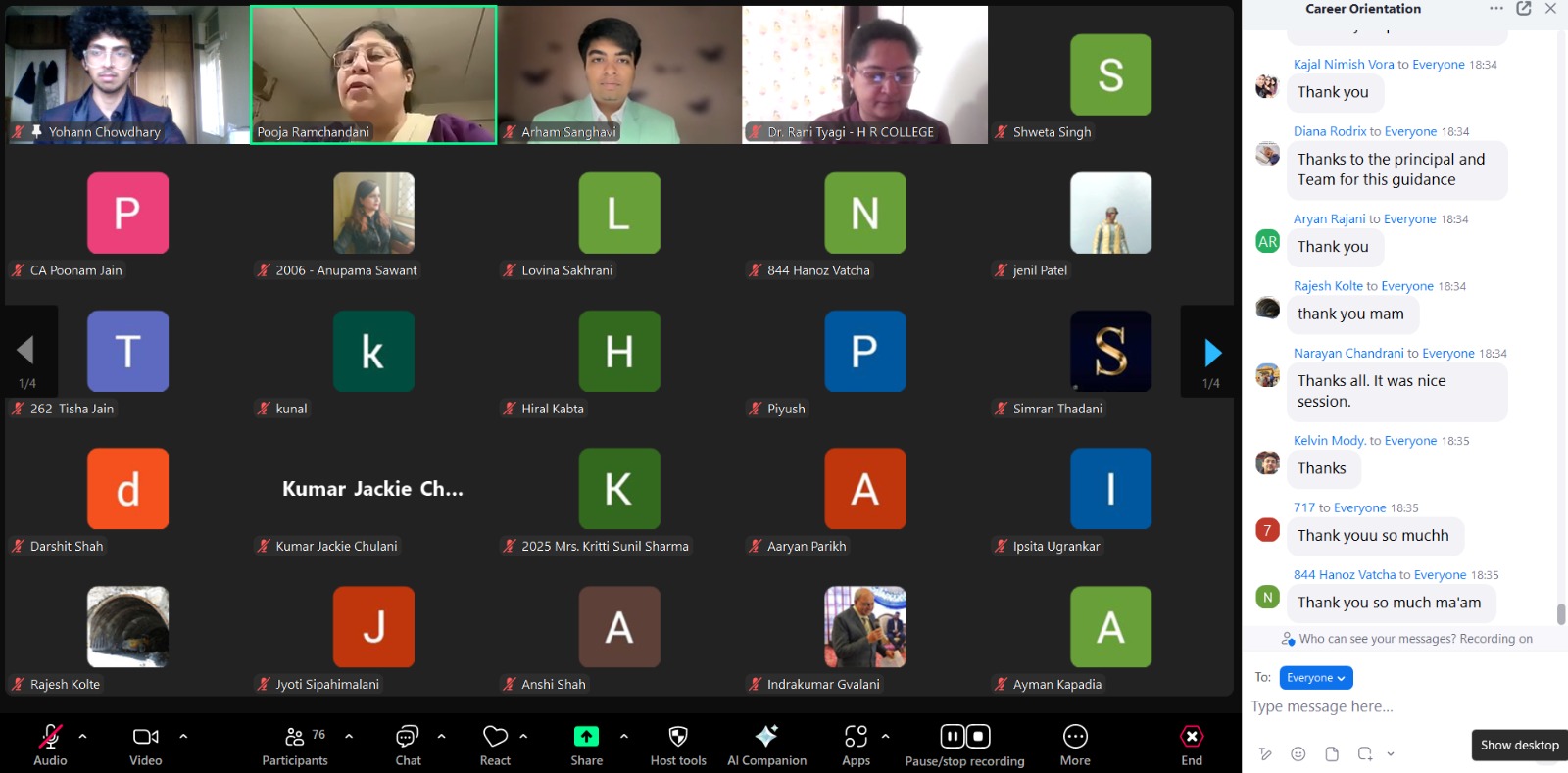 The Career Orientation Programme held on 11th May 2025 via Zoom guided over 250 SYJC students through the undergraduate options offered by H.R. College. The session, hosted smoothly by Yohann Chowdhary and Arham Sanghavi, featured presentations from coordinators of nine courses, each outlining curriculum highlights, opportunities, and career pathways. A brief Q&A addressed student queries, followed by a warm expression of gratitude and a virtual group photo. Ms. Anupama Sawant concluded the event with encouraging remarks, reinforcing the importance of making informed academic choices.